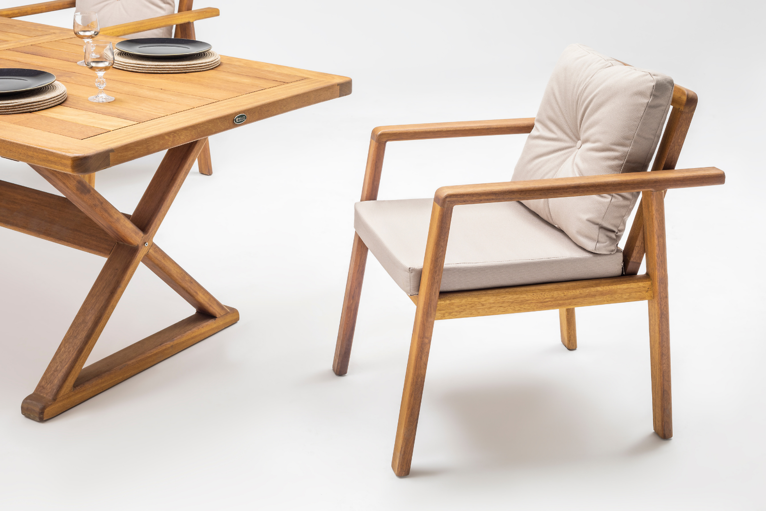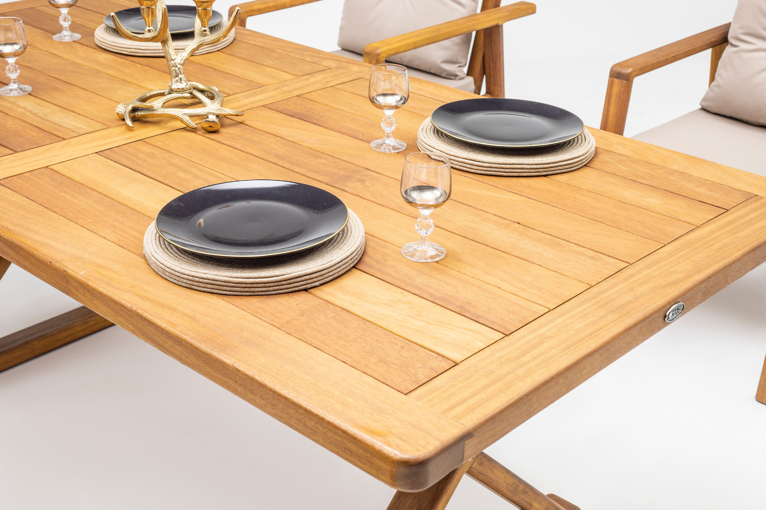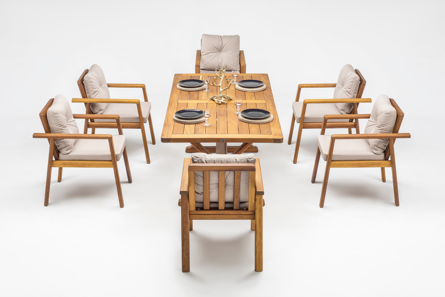 100x200 ölçüsü ve 6 sandalyesiyle ahşabın göze hitabıyla Artemis masa takımını sizlere sunuyoruz. İroko ağacının güneş ışınlarına ve yağmura dayanıklılığı, kumaşların su itici özelliği taşıması ve tasarımdaki estetik görümüyle Napoli masa takımını sizler için tasarladık.
