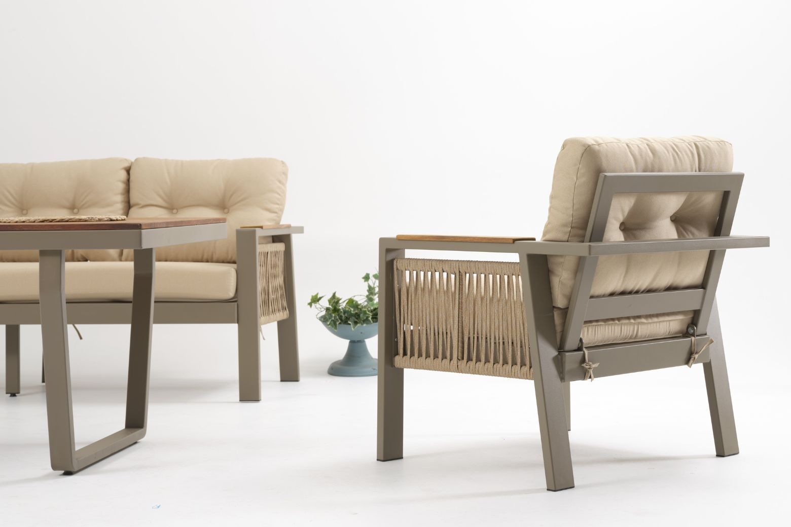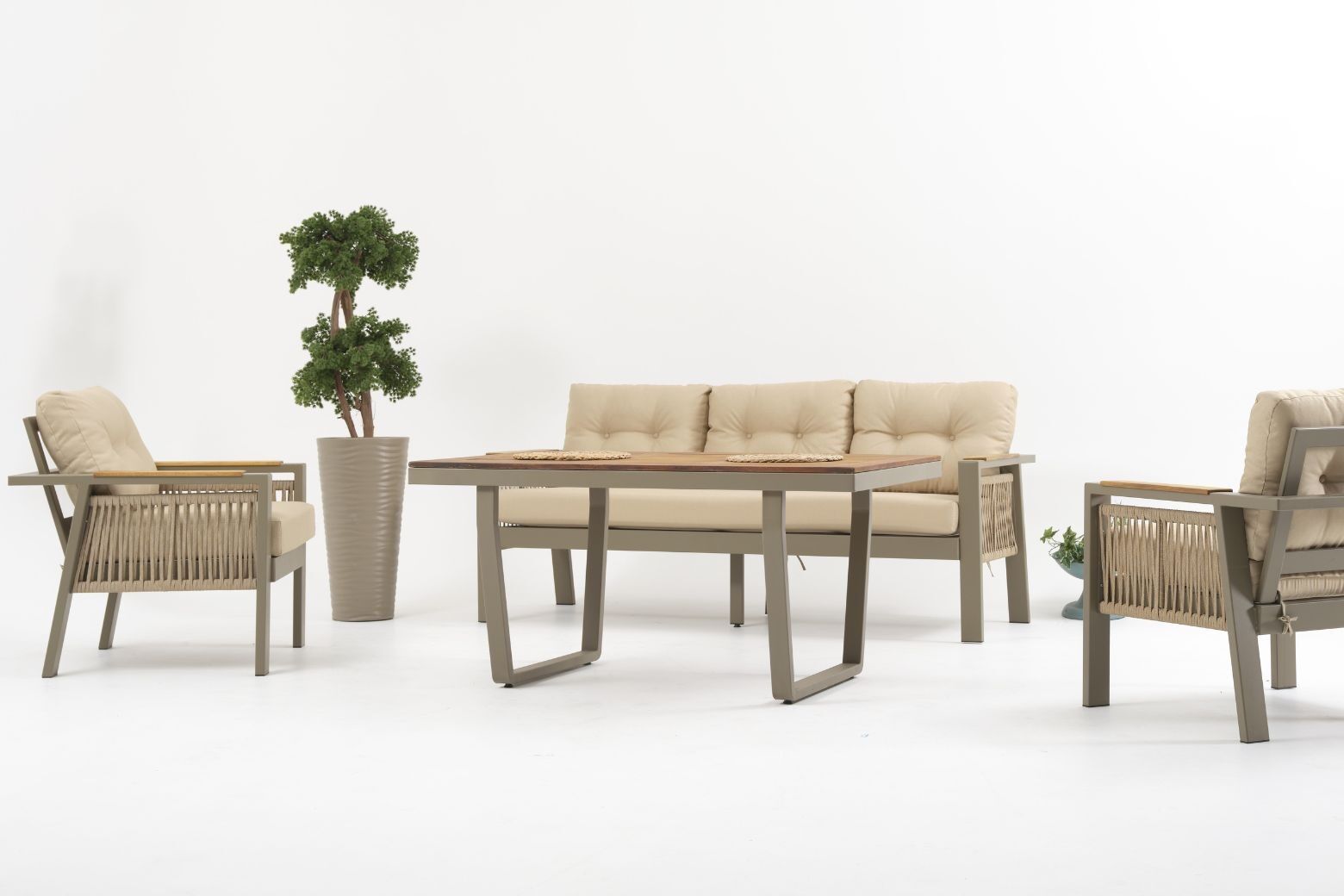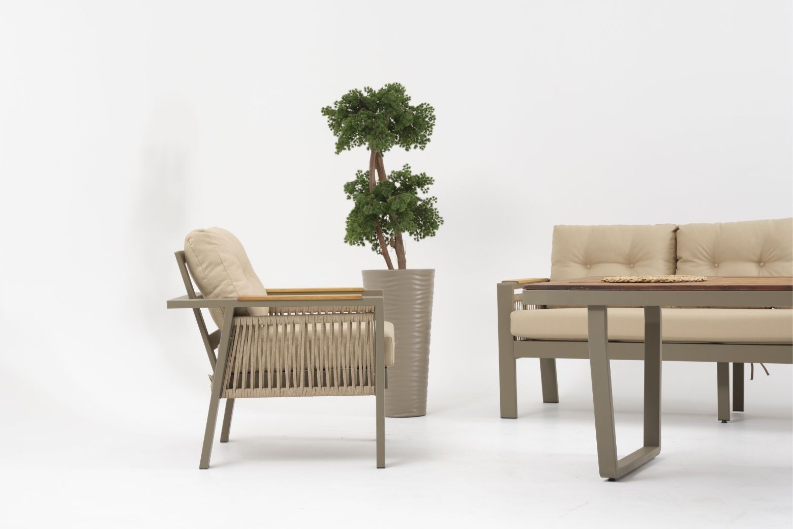 Alüminyumun güçlü yapısı ve Luxio-Cord Outdoor ipin şıklığı ireko ahşabın sıcaklığıyla birleşiyor. Larissa Plus oturma grubu bahçenizde keyifle vakit geçirmenize olanak sağlayacak.