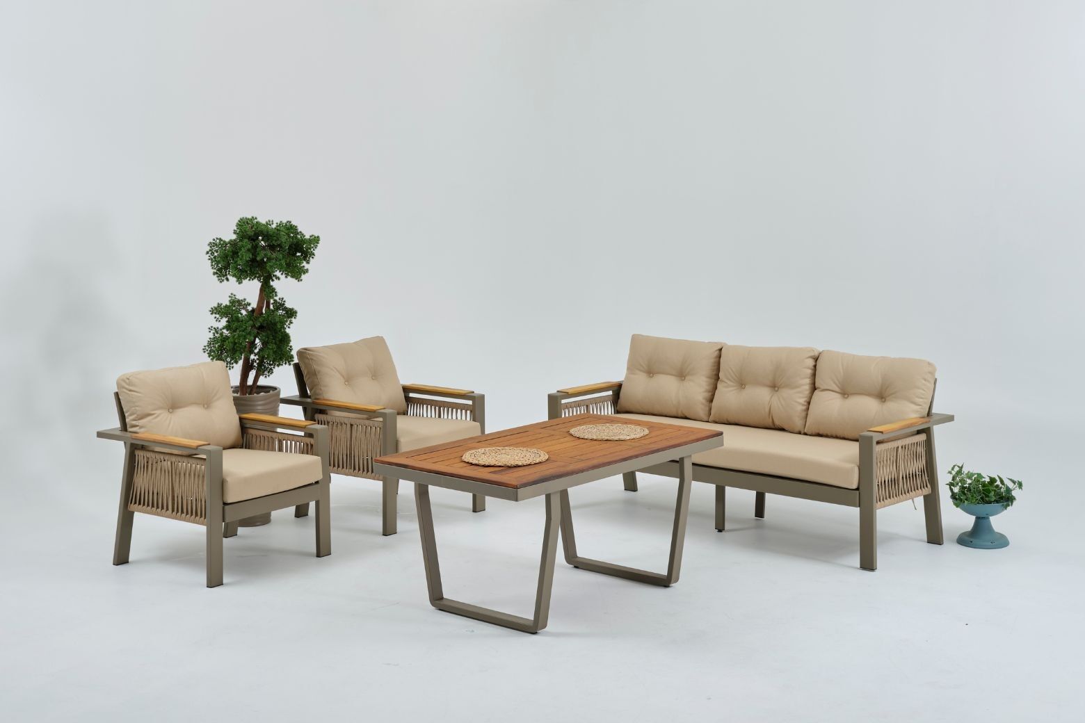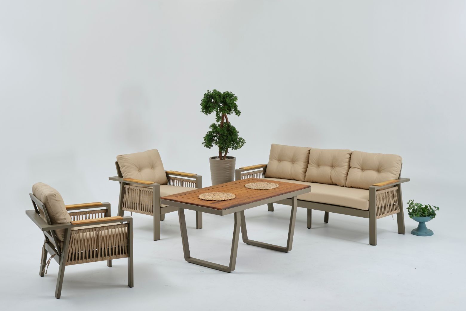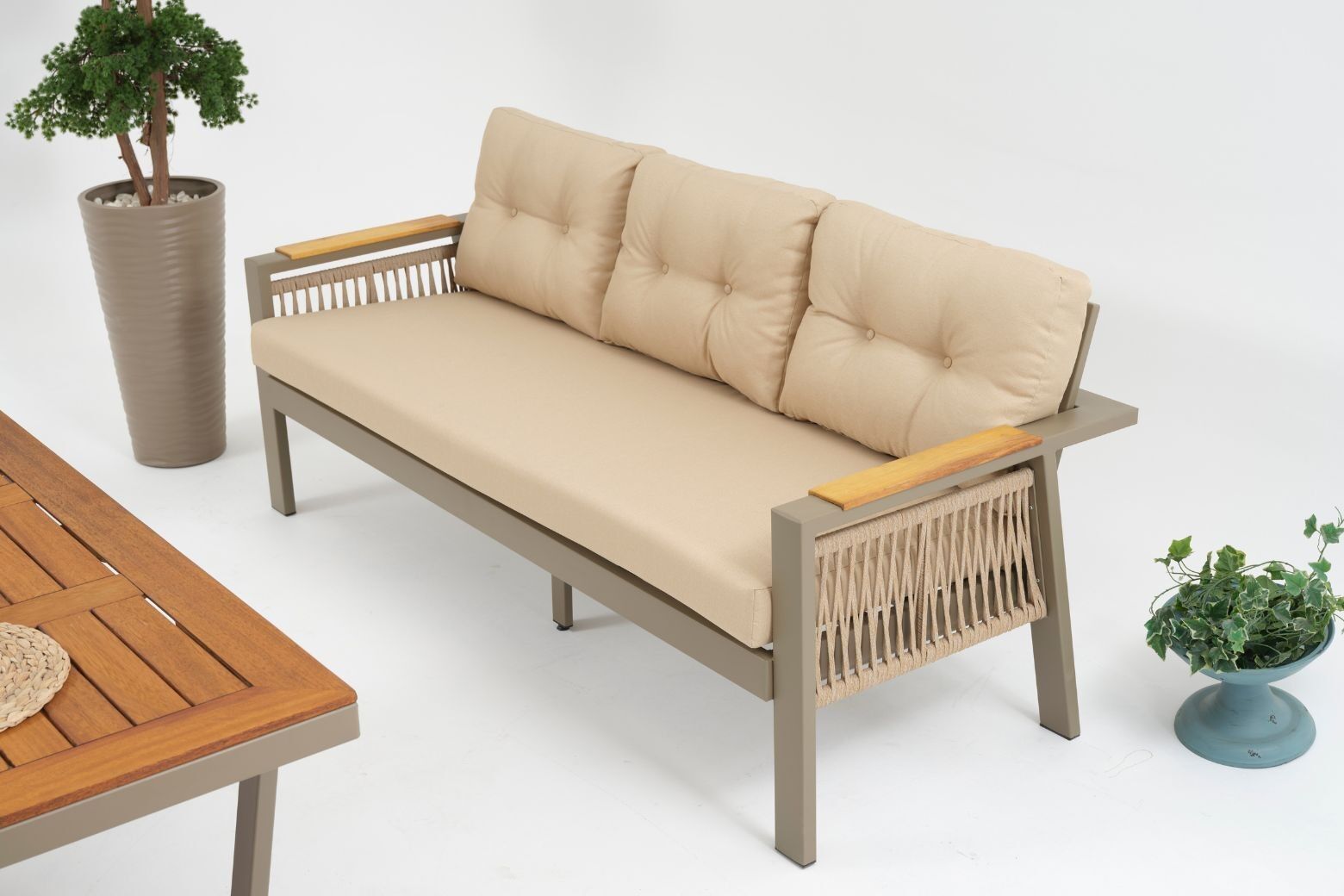 Alüminyumun güçlü yapısı ve Luxio-Cord Outdoor ipin şıklığı ireko ahşabın sıcaklığıyla birleşiyor. Larissa Plus oturma grubu bahçenizde keyifle vakit geçirmenize olanak sağlayacak.