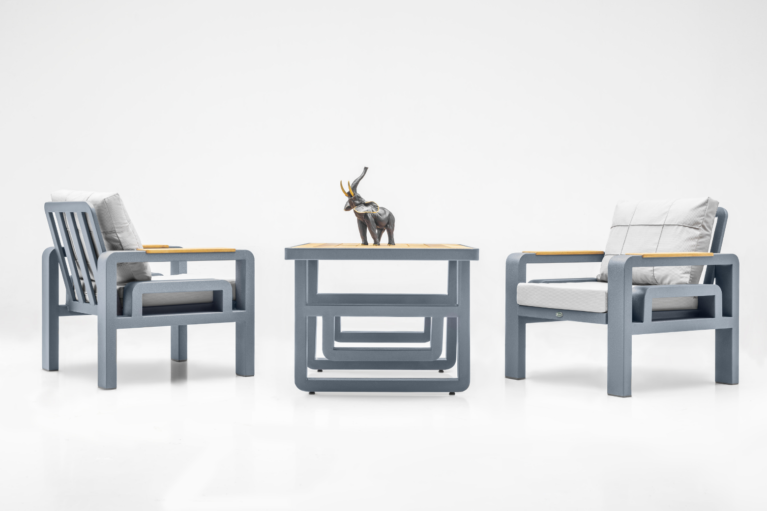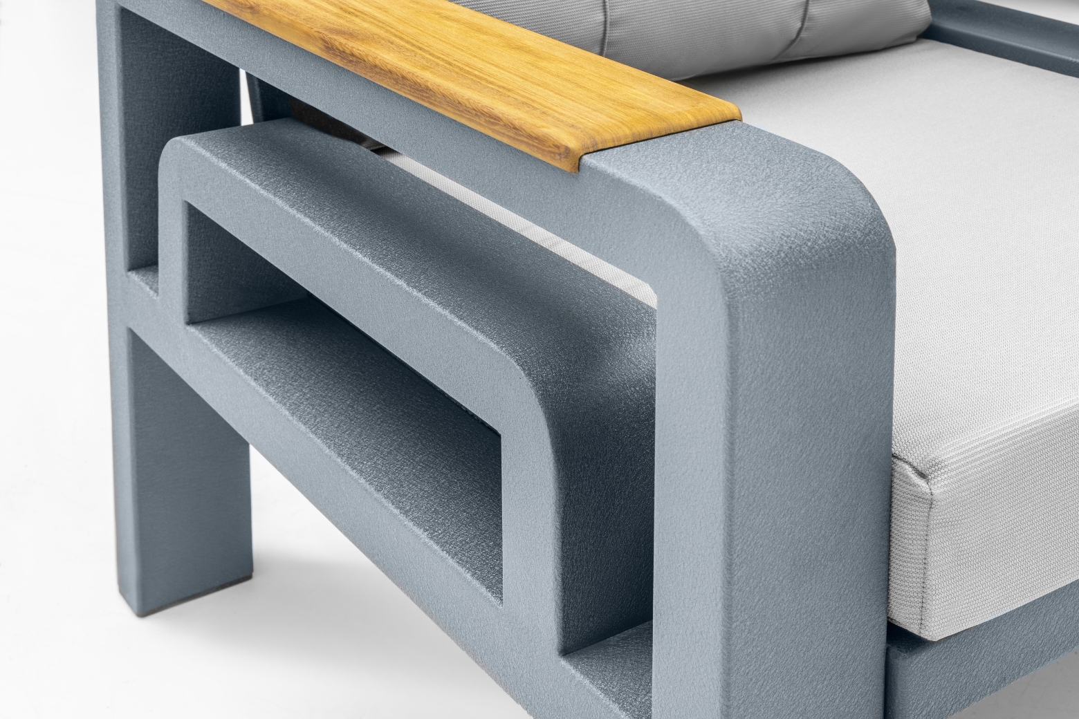 Ürün alüminyumdan üretilmekte olup elektrostatik toz boya ile boyanmaktadır. Ahşap kısımlarında iroko ağacı kullanılmaktadır. Üründe kullanılan minderler 32 DNS yoğunluğa sahiptir, minder kumaşları su itici ve leke tutmaz özelliktedir.